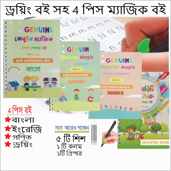 Drawing Special 4 PCS Kids Magic Handwritting Practice Book (Bangla,English,Math & Drawing)